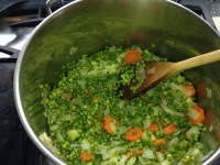Den un wea di sopi grandi, pone e butter smelt. Pone e bacon corta chikito hasa den e butter. Agrega e celder, ciboyo y wortel. Pone salo y pepper na gusto. Ora e cibiyo cuminsa bira doorzichting (translucent) agrega e erwten y mescla esaki bon.Agrega awa pa tapa cu e ingredientenan. Tira e bouillonnan di berdura y laga e sopi cushina pa 2 ora. Cada 15 minuut tira bista pa wak e awa no baha mucho. Agrega awa si mester.