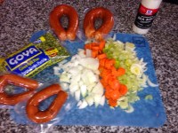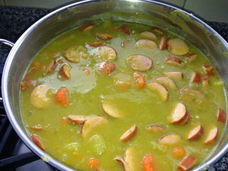 Ora e erwten cuminsa bira moli agrega e rookworst y batata corta na bloki. Laganan cushina pa 15 minuut. Check e batata si esaki ta moli.